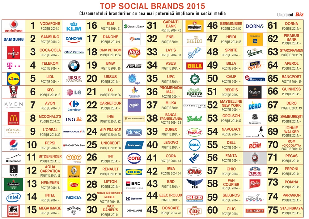 Întreaga zi a fost plină de energie, de prezentări realist-optimiste. Genul de eveniment de la care pleci plin de entuziasm, ai impresia că poți să faci din … bici, că e de ajuns să-ți explorezi creativitatea. O să atașez și eu topul, cu mențiunea că dacă un brand nu dorește să ia parte la studiu, înseamnă că îi e puțin frică. Studiul Top Social Brands 2015 este rezultatul unei analize complexe a activităților desfășurate de brandurile active în social media, în intervalul 1 ianuarie 2014 – 31 ianuarie 2015. În analizarea brandurilor au fost luate în calcul toate tipurile de activități care pot fi desfășurate pentru promovarea în social media: blog de companie/blog de brand; campanii pe bloguri; pagina de Facebook, campanii pe Facebook; Facebook Ads; aplicații pe Facebook; cont de Twitter; campanii pe Twitter; profil actualizat pe Wikipedia; cont Flickr; cont YouTube; cont Google+, cont Instagram; cont Pinterest, spoturi virale; site-uri de user-generated content; inițiere sau sponsorizare a unor evenimente dedicate blogosferei sau mediilor sociale; activități de customer care și de recrutare prin intermediul canalelor de social media; acțiuni de endorsare a campaniilor din social media pe TV sau alte medii tradiționale.