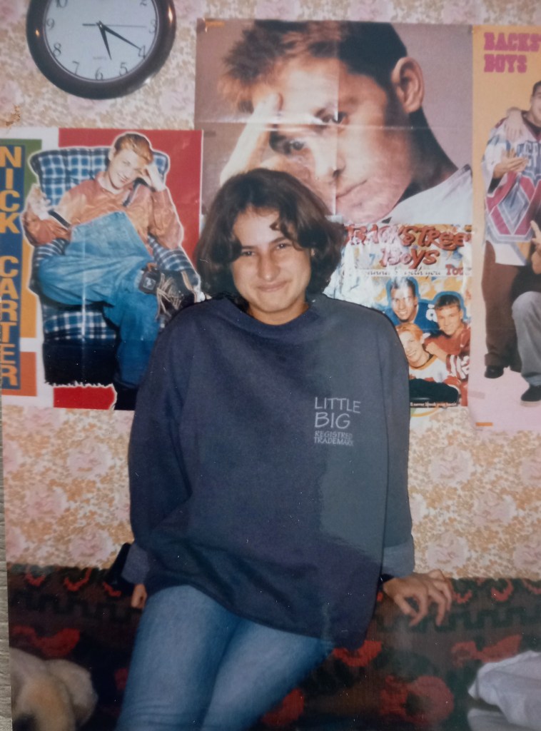 Pun și poza de care ziceam, dintr-o vreme în care pe fundal rula MTV când făceam teme și la casetofonul Sony care nu derula singur caseta, ascultam mai degrabă Prodigy. Dar băieții de pe pereți erau frumoși și era reconfortant să fie primul lucru la care te uiți când te trezești. Dacă nu remarcați, vă zic că velința era din colecția țesută de mămăița, care mai mult ca sigur se alinase cu gândul că și eu și băieții de la Prodigy eram posedați (am expus-o la muzica lor destul de mult în timpul vacanțelor de vară). E și un colț de urs de pluș primit de la John-ul meu la aniversarea respectivelor 17 primăveri.